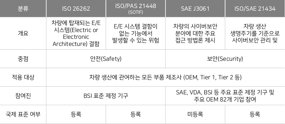 ISO/SAE 21434와 더불어 ISO 26262와 ISO/PAS 21448이 국제표준으로써 존재한다. ISO 26262는 E/E 시스템(Electric or Electronic Architecture) 상의 결함이 중점인 국제 표준이고 ISO/PAS 21448 또한 ISO 26262에서 다루지 않는 결함이 없는 기능에서 발생할 수 있는 위험을 다루고 있어 보안(Security)보다는 안전(Safety)에 더 중점을 두고 있다. 때문에 보안에 대한 국제 표준의 필요성에 따라 J3061을 발행한 SAE와 ISO에서 차량 산업의 보안 요구 사항에 만족을 위해 ISO/SAE 21434 발행이 결정됐다.