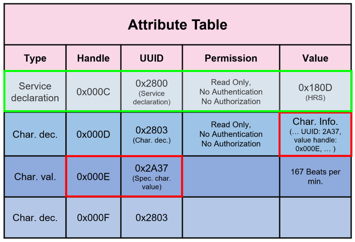 이러한 서비스와 특성에 대한 정보는 attribute라는 최소 데이터 유닛에 의해 정의되고, BLE 디바이스 내의 attribute에 대한 정보는 최종적으로 attribute table 내에 저장됩니다. attribute는 type(UUID) handle, permission 세 가지 정보를 포함하는데, Attribute table 예시는 아래의 그림과 같습니다.