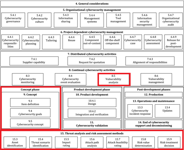Overview에서 언급한 바와 같이, TARA 활동은 ISO / SAE 21434 Section 15에 별도로 정의되어 있으며, 이는 수행 순서가 아닌 하나의 방법론이다. (왜 한글자료를 안썻나면... 일부 잘못 표시된 박스가 있어서 그대로 쓸 수 없었다.)