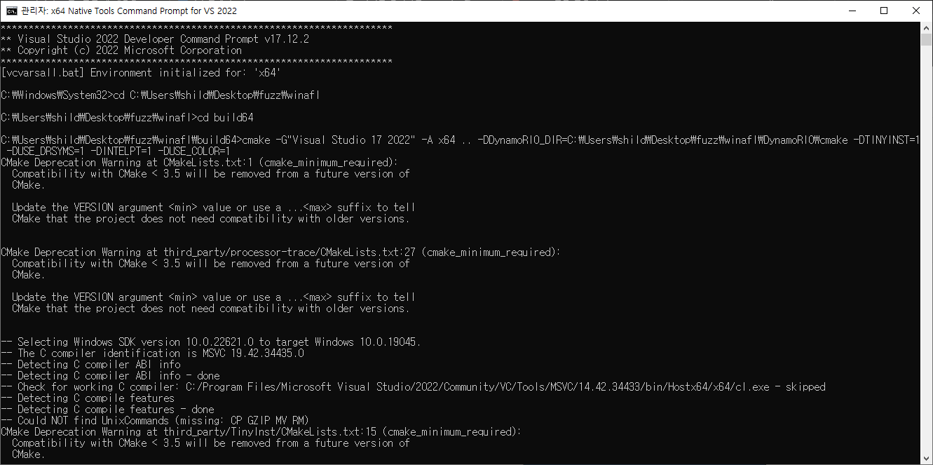 cmake -G"Visual Studio 17 2022" -A x64 .. -DDynamoRIO_DIR= <path to dynamorio dir> -DTINYINST=1 -DUSE_DRSYMS=1 -DINTELPT=1 -DUSE_COLOR=1