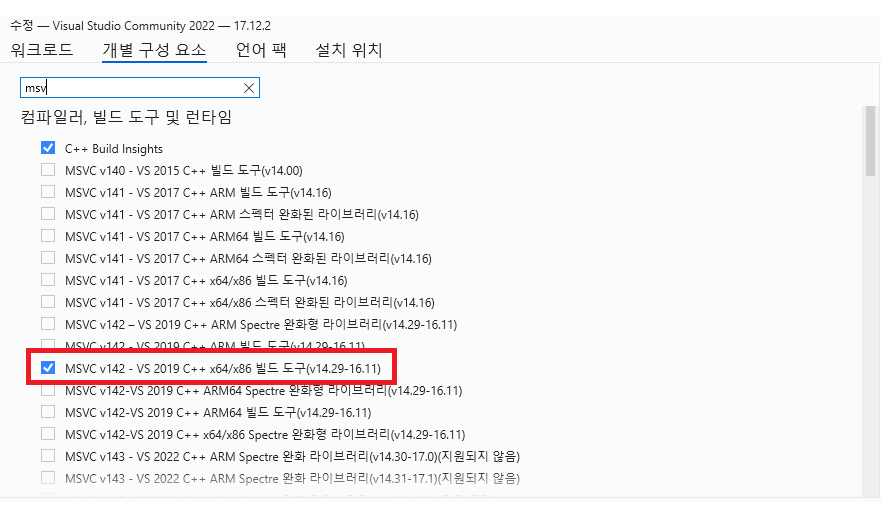 Visual Studio 설치 시 MSVC v142 - VS 2019 C++ x64/x86 빌드 도구를 반드시 설치하자.