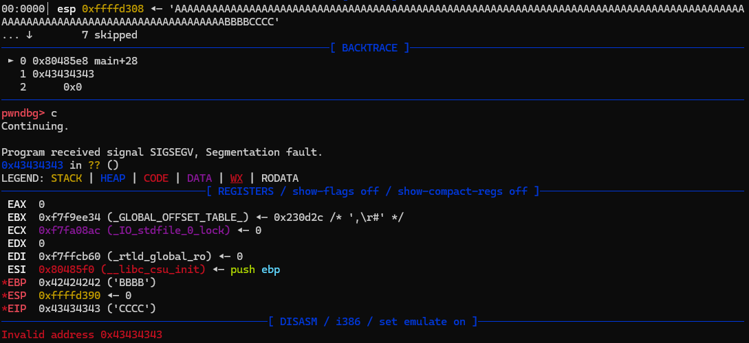32bit 아키텍처 이기 때문에 EIP가 어느 영역에서 변조되는지 동적분석을 통해 확인해야 한다. NX를 제외한 다른 보호기법이 적용되어 있지 않고, 운영체제의 버전이 낮기 때문에 Dummy도 없을 것으로 생각되지만 그래도 검증은 해보자. 예상이 맞다면, 버퍼의 크기가 128 (0x80)byte 이므로 그 뒤에 순서대로 SFP, EIP가 위치해 있을 것으로 생각 된다. (다른 변수가 없기 때문에 Stack에 할당된 공간은 128byte 크기의 buf 배열이 유일하기 때문) 따라서 136 byte를 덮음으로서 EIP가 변조될 것이라 생각하였다.