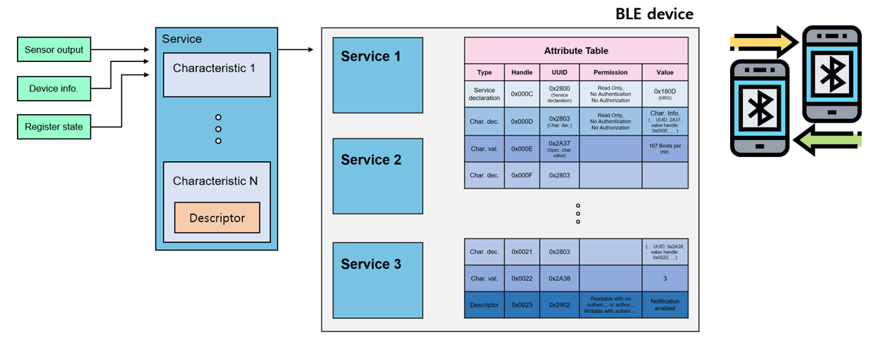 BLE 디바이스는 하나 이상의 service를 포함할 수 있으며, 각각의 service 또한 하나 이상의 characteristic을 포함할 수 있습니다.
